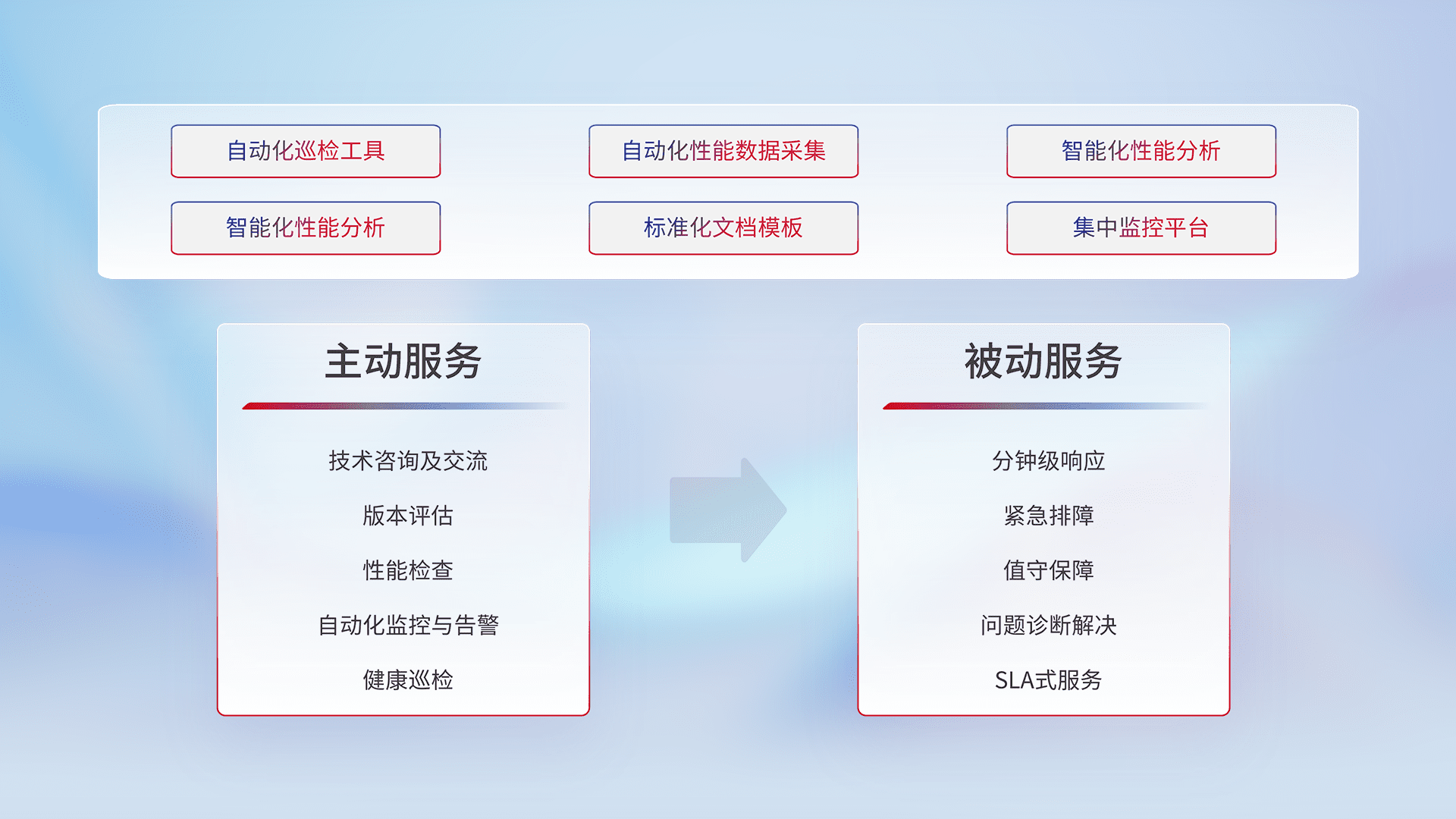 智能化工具和标准化文档,,,保障服务质量,,提供主动服务(包含技术咨询、、、版本评估、、、、性能检查、、、自动化监控与告警、、、健康巡检)和被动服务包含(分钟级响应、、紧急排障、、、、值守保障、、、、问题诊断解决、、SLA服务)。。。