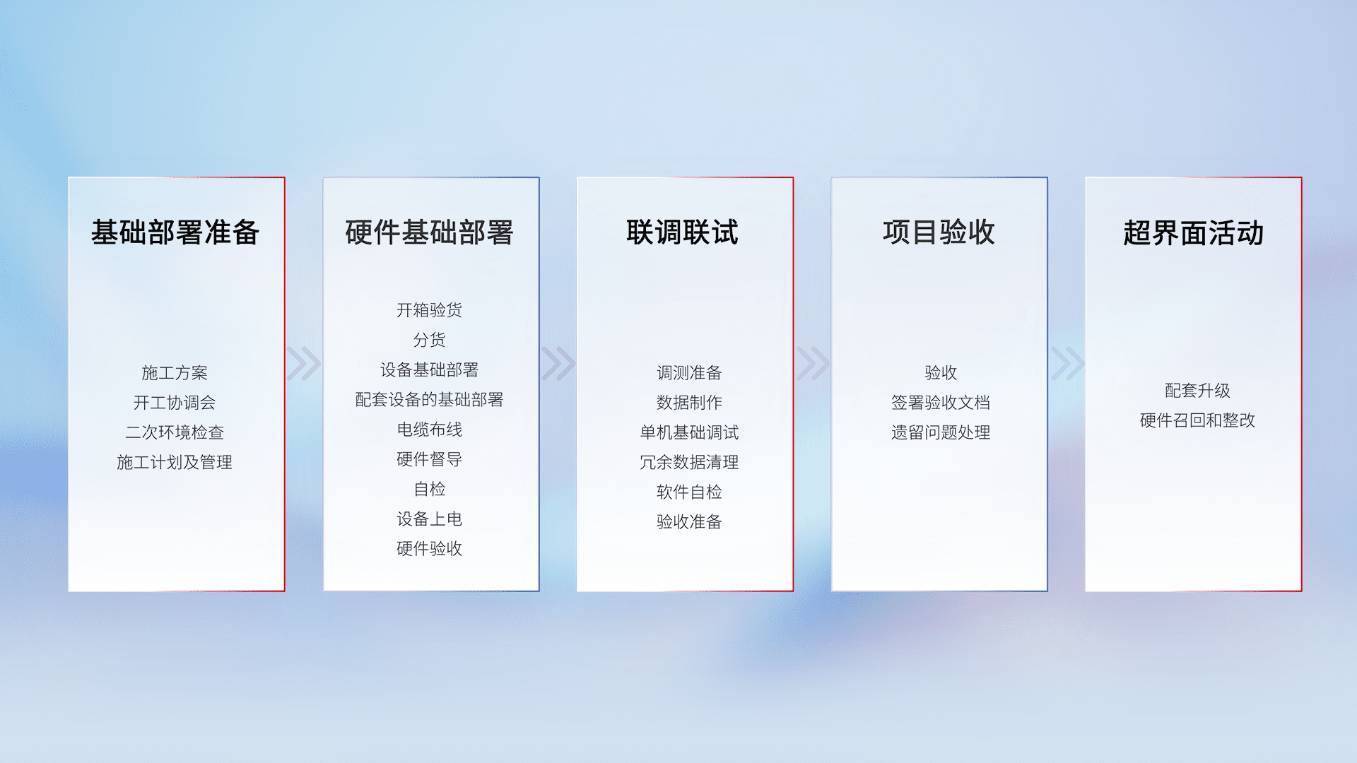 从基础部署准备、、、硬件基础部署、、、联调联试、、、项目验收、、、、越界面活动的全过程可追溯,,,,保证施工质量和进度。。